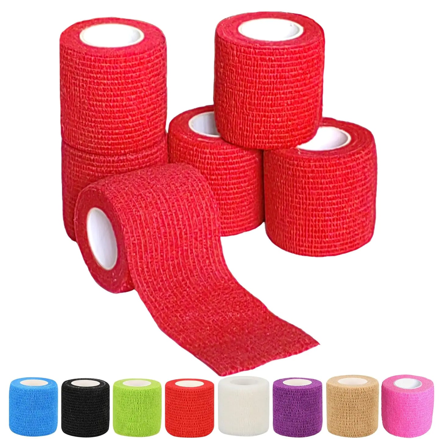 Self adhesive abilityOne of the most exciting features is that it adheres to itself offers excellent support no clips or fasteners are needed. They are designed only to stick to itself not to skin clothing or hair. No more struggles when pulling off bandages!Easy to tear and applyThese cohesive bandage wrap is easy to cut or tear. Hand-tear to desired length easy for you to wrap or change bandages. Pain-free removal that wont damage skin. Practical and easy to carry.Size: 2 inchesMaterial: Made of natural latex lightweight fabricColor: redPackage Includes:6 Rolls Self-adhesive Elastic Bandage Self Adherent Cohesive Wrap Bandages for Athletic Sport.